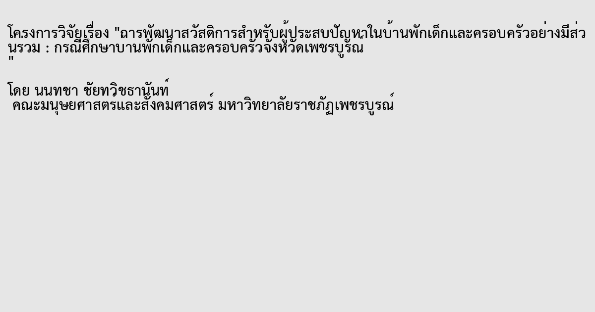 การพัฒนาสวัสดิการสำหรับผู้ประสบปัญหาในบ้านพักเด็กและครอบครัวอย่างมีส่วนร่วม : กรณีศึกษาบ้านพักเด็กและครอบครัวจังหวัดเพชรบูรณ์