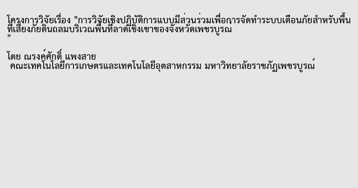 การวิจัยเชิงปฏิบัติการแบบมีส่วนร่วมเพื่อการจัดทำระบบเตือนภัยสำหรับพื้นที่เสี่ยงภัยดินถล่มบริเวณพื้นที่ลาดเชิงเขาของจังหวัดเพชรบูรณ์