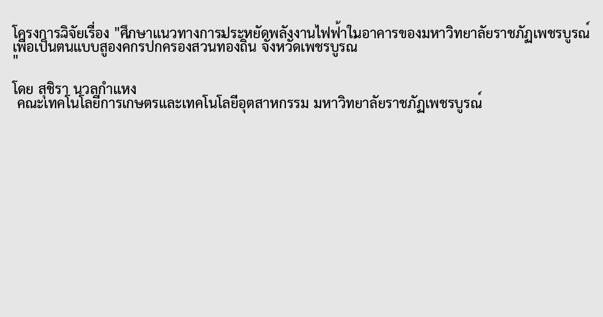 ศึกษาแนวทางการประหยัดพลังงานไฟฟ้าในอาคารของมหาวิทยาลัยราชภัฏเพชรบูรณ์ เพื่อเป็นต้นแบบสู่องค์กรปกครองส่วนท้องถิ่น จังหวัดเพชรบูรณ์