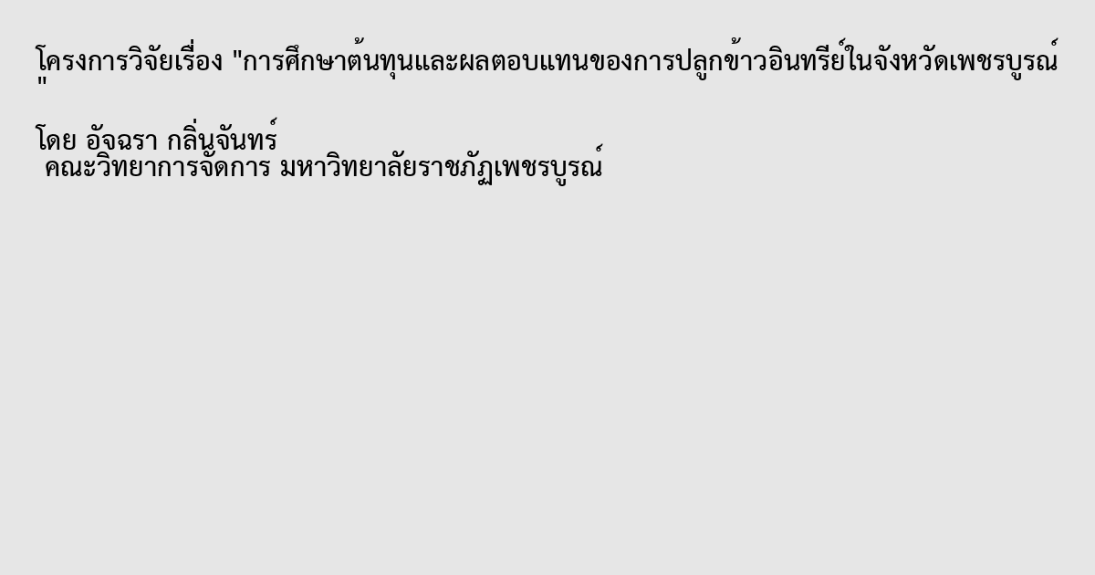 การศึกษาในครั้งนี้มีวัตถุประสงค์เพื่อการศึกษาต้นทุนและผลตอบแทนการทางการเงินของเกษตรกร และการวิเคราะห์ ผลตอบแทน การปลูกข้าวอินทรีย์ในเขตพื้นที่จังหวัดเพชรบูรณ์ของเกษตรกรผู้ปลูกข้าวอินทรีย์ในพื้นที่ 8 อำเภอ ได้แก่ อำเภอเมือง อำเภอหล่มสัก อำเภอน้ำหนาว อำเภอเขาค้อ อำเภอเขาค้อ อำเภอหนองไผ่ อำเภอชนแดน อำเภอวังโปร่ง และอำเภอศรีเทพ จำนวน 70 ราย รายการประเมินต้นทุน-ผลตอบแทนจากการปลูกข้าวอินทรีย์ในจังหวัดเพชรบูรณ์โดยแบ่งแยกตามขนาดพื่นที่ในการผลิต คือพื้นที่ขนาดเล็ก (1-10 ไร่) พื้นที่ขนาดกลาง (11-29 ไร่) และขนาดใหญ่ (30 ไร่ขึ้นไป) พบว่า ต้นทุนการผลิตข้าวอินทรีย์ของเกษตรกรพื้นที่ปลูกขนาดเล็ก มีต้นทุนต่อหน่วยต่ำที่สุด คือ 16.37 บาท/กิโลกรัม รองลงมาคือพื้นที่ขนาดใหญ่ มีต้นทุนต่อหน่วย 17.90 บาท/กิโลกรัม และพื้นที่ขนาดกลางมีต้นทุน 19.01 บาท/กิโลกรัม ตามลำดับ โดยหากเปรียบเทียบระหว่างเกษตรกรทั้ง 3 กลุ่ม จะเห็นได้ว่าเหษตรหรที่การปลูกข้าวอินทรีย์ในพื้นที่ขนาดเล็ก 1-10 ไร่ มีมูลค่าปัจจุบันสุทธิ (NPV) เท่ากับ 35,745.90 บาท และค่าอัตราส่วนผลประโยชน์ต่อต้ทุน (B/C) เท่ากับ 1.60 มากกว่าเกษตรกรที่ปลูกข้าวอินทรีย์ในพื้นที่ขนาดใหญ่และขนาดกลางซึ่งมีมูลค่าปัจจุบันสุทธิ (NPV) เท่ากับ 31,957.16 บาท และ 21,519.88 บาท ค่าอัตราส่วนผลประโยชน์ต่อต้นทุน (B/C) เท่ากับ 1.55 และ 1.40 สำหรับการวิเคราะห์ต้นทุนการผลิตข้าวอินทรีย์เปรียบเทียบรายอำเภอของจังหวัดเพชรบูรณ์ พบว่าอำเภอเขาค้อมีต้นทุนในการปลูกข้าวอินทรีย์ต่ำสุด คิดเป็นจำนวนเงินเฉลี่ย เท่ากับ 12.25 บาทต่อกิโลกรัม รองลงมาเป็นอำเภอหนองไผ่ มีต้นทุนเฉลี่ยเท่ากับ 12.69 บาทต่อกิโลกรัม อำเภอหล่มสัก มีต้นทุนเฉลี่ยเท่ากับ 12.81 บาทต่อกิโลกรัม โดยพื้นที่อำเภอเขาค้อ มีอัตราส่วนผลประโยชน์ต่อต้นทุน (B/C) สูงสุดเท่ากับ 2.29 รองลงมาเป็นพื้นที่อำเภอหนองไผ่ และอำเภอหล่มสัก มีค่าเท่ากับ 2.21 และ 2.14 พบว่าการลงทุนปลูกข้าวอินทรีย์ของกษตรกรทั้ง 3 ขนาดมีความเป็นได้ในการลงทุนโดยเฉพาะเกษตรกรที่ปลูกข้าวอินทรีย์ในพื้นที่ขนาดเล็ก