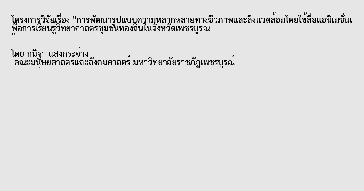 การพัฒนารูปแบบความหลากหลายทางชีวภาพและสิ่งแวดล้อมโดยใช้สื่อแอนิเมชั่นเพื่อการเรียนรู้วิทยาศาสตร์ชุมชนท้องถิ่นในจังหวัดเพชรบูรณ์