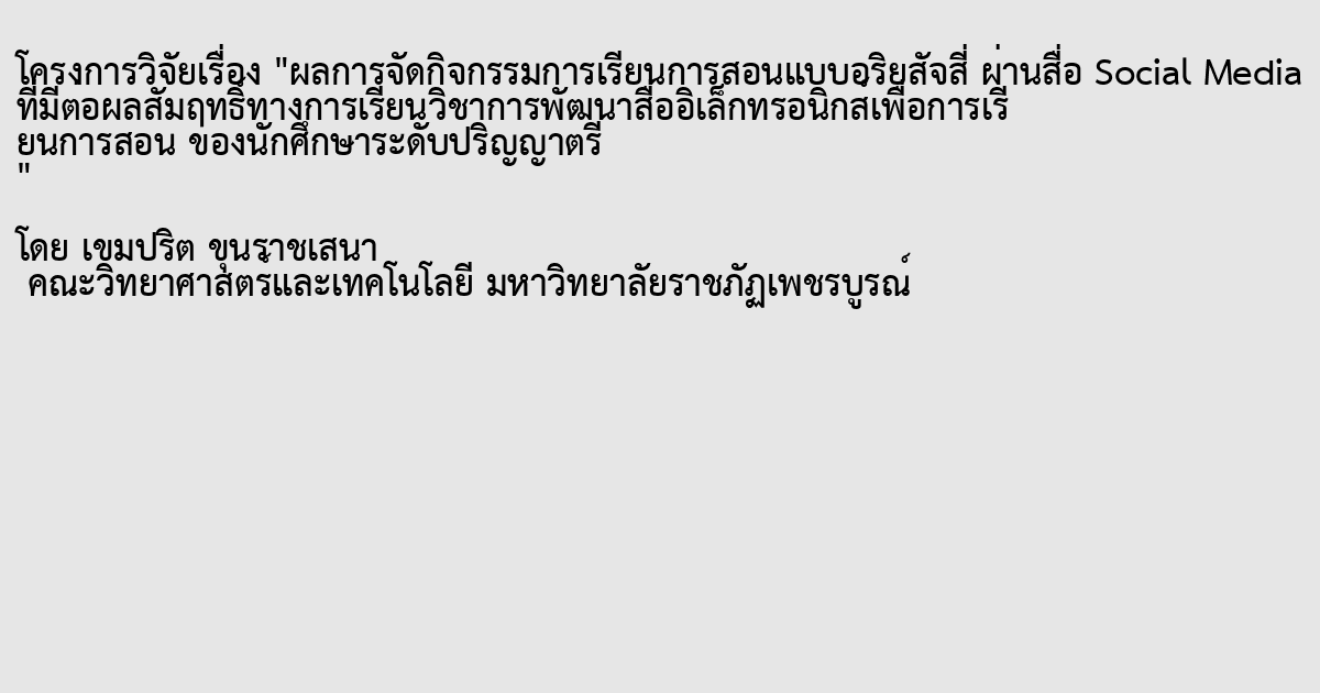 ผลการจัดกิจกรรมการเรียนการสอนแบบอริยสัจสี่ ผ่านสื่อ Social Media ที่มีต่อผลสัมฤทธิ์ทางการเรียนวิชาการพัฒนาสื่ออิเล็กทรอนิกส์เพื่อการเรียนการสอน ของนักศึกษาระดับปริญญาตรี