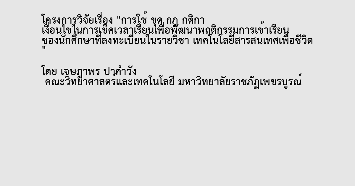 การใช้ ชุด กฎ กติกา เงื่อนไขในการเช็คเวลาเรียนเพื่อพัฒนาพฤติกรรมการเข้าเรียน ของนักศึกษาที่ลงทะเบียนในรายวิชา เทคโนโลยีสารสนเทศเพื่อชีวิต