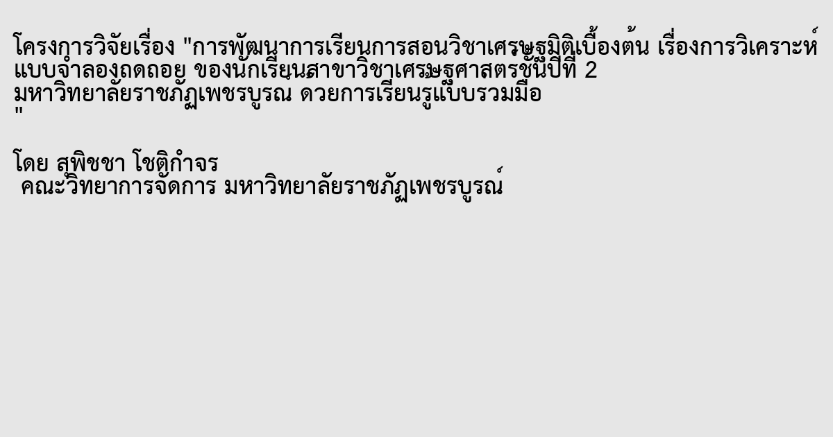 การพัฒนาการเรียนการสอนวิชาเศรษฐมิติเบื้องต้น เรื่องการวิเคราะห์ แบบจำลองถดถอย ของนักเรียนสาขาวิชาเศรษฐศาสตร์ชั้นปีที่ 2 มหาวิทยาลัยราชภัฏเพชรบูรณ์ ด้วยการเรียนรู้แบบร่วมมือ