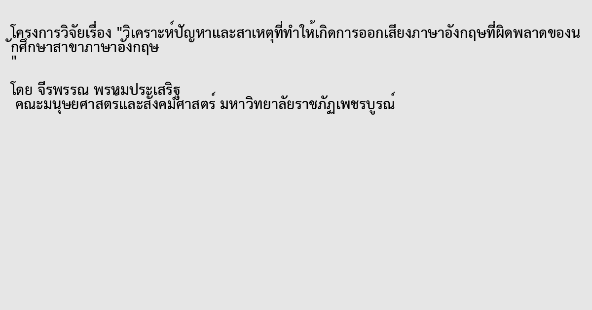 การวิจัยครั้งนี้มีวัตถุประสงค์เพื่อศึกษาเสียงพยัญชนะท้ายคำภาษาอังกฤษที่เป็นปัญหาในการออกเสียง เพื่อวิเคราะห์ปัญหาและสาเหตุที่ทำให้เกิดการออกเสียงภาษาอังกฤษที่ผิดพลาดของนักศึกษาสาขาวิชาภาษาอังกฤษ เพื่อนำมาศึกษาผลกระทบของภาษาแรกไปสู่ภาษาต่างประเทศและเพื่อนำมาพัฒนาการเรียนการสอน