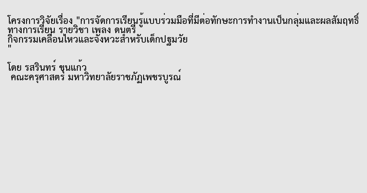 การจัดการเรียนรู้แบบร่วมมือที่มีต่อทักษะการทำงานเป็นกลุ่มและผลสัมฤทธิ์ทางการเรียน รายวิชา เพลง ดนตรี กิจกรรมเคลื่อนไหวและจังหวะสำหรับเด็กปฐมวัย