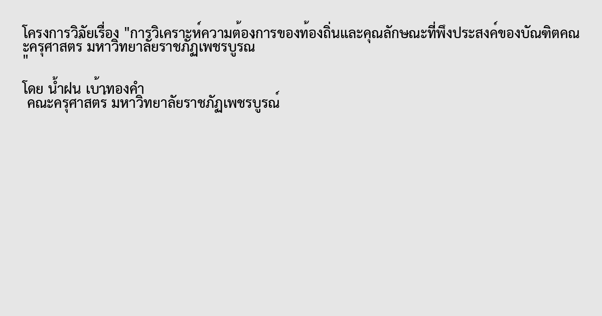 การวิเคราะห์ความต้องการของท้องถิ่นและคุณลักษณะที่พึงประสงค์ของบัณฑิตคณะครุศาสตร์มหาวิทยาลัยราชภัฏเพชรบูรณ์มีวัตถุประสงค์เพื่อศึกษาคุณลักษณะที่พึงประสงค์ของบัณฑิตคณะครุศาสตร์มหาวิทยาลัยราชภัฏเพชรบูรณ์โดยใช้ระเบียบวิธีวิจัยสองรูปแบบคือการวิจัยเชิงเอกสาร (Document Research) และการวิจัยเชิงสำรวจ (Survey Research) กำหนดกลุ่มเป้าหมายคือสถานศึกษาทุกระดับชั้นทุกโรงเรียนในจังหวัดเพชรบูรณ์จำนวน 12 โรงเรียนมีบัณฑิตครุศาสตร์มหาวิทยาลัยราชภัฏเพชรบูรณ์ปฏิบัติหน้าที่อยู่ในโรงเรียนข้อมูลจากศูนย์ฝึกวิชาชีพคณะครุศาสตร์มหาวิทยาลัยราชภัฏเพชรบูรณ์และผู้ให้ข้อมูลสำคัญ ได้แก่ ผู้บริหารสถานศึกษาที่จัดการศึกษาในระดับอนุบาลระดับประถมศึกษามัธยมศึกษาในเขตจังหวัดเพชรบูรณ์ 112 แห่งผลการวิจัยพบว่ามีโรงเรียนตอบแบบสอบถามกลับมาทั้งสิ้น 63 โรงเรียนคิดเป็นร้อยละ 56.25 จากจำนวนผู้ใช้บัณฑิตทั้งหมดโรงเรียนที่ตอบแบบสอบถามสูงสุดคือโรงเรียนในระดับมัธยมศึกษาตอนต้นและตอนปลายคิดเป็นร้อยละ 30.16 ตำแหน่งของผู้ประเมินที่ตอบแบบสอบถามส่วนมากคือตำแหน่งผู้อำนวยการร้อยละ 31.16 เป็นเพศชายคิดเป็นร้อยละ 52.38 อายุเฉลี่ยอยู่ระหว่าง 50-59 ปีสาขาวิชาที่มีนักศึกษาปฏิบัติหน้าที่ในโรงเรียนและมีผู้ใช้บัณฑิตตอบแบบประเมินสูงสุดคือสาขาวิชาการศึกษาภาษาอังกฤษร้อยละ 26.76 ผลการประเมินในคุณลักษณะในทุกด้านอยู่ในระดับมากหรือมีการแสดงออกของพฤติกรรมที่พึงประสงค์ของบัณฑิตบ่อยมาก (x̄ = 4.20, S. D. = 0.12) แสดงว่าบัณฑิตคณะครุศาสตร์มีคุณลักษะอันพึงประสงค์ของวิชาชีพสามารถเป็นครูในโรงเรียนได้ตามหลักสูตรที่สำเร็จการศึกษามีเพียงข้อเสนอแนะบางประการจากผู้ประเมินที่ต้องการให้คณะครุศาสตร์เพิ่มให้เติมแก่บัณฑิตคือด้านคุณธรรมจริยธรรม การวางแผนงานเพื่อการพัฒนาตนและงานที่เกี่ยวข้อง การเสาะแสวงหาความรู้ตามรูปแบบของการศึกษาตลอดชีพ การเสริมสร้างประสบการณ์ด้านการสื่อสารผ่านสื่อเทคโนโลยี