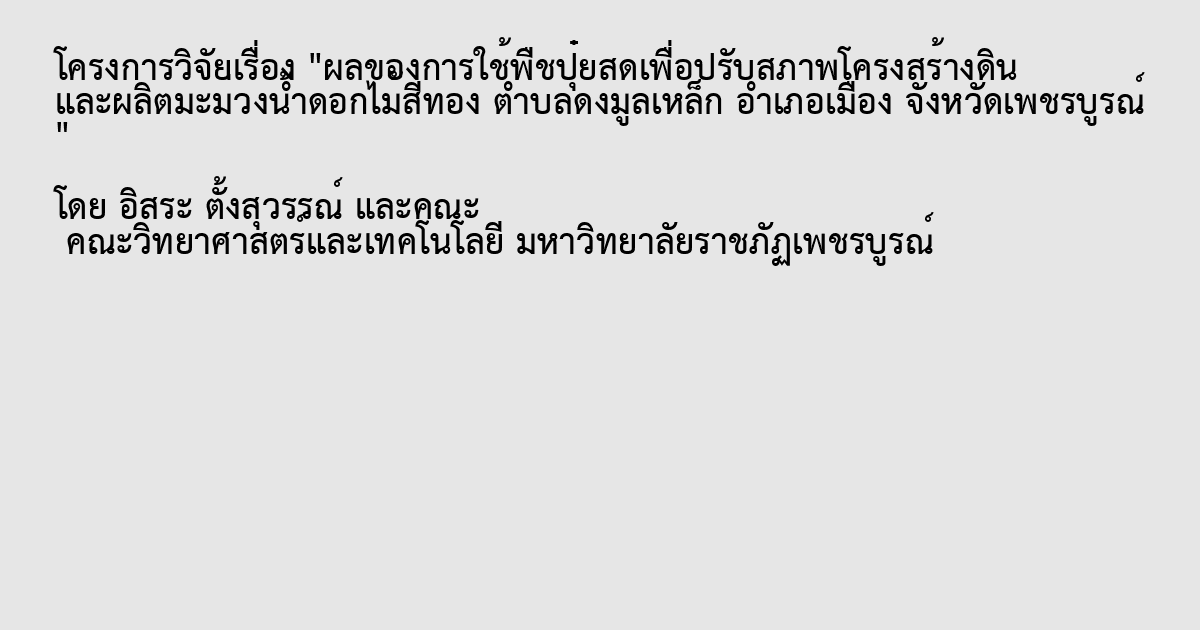 การวิจัยในครั้งนี้มีวัตถุประสงค์เพื่อศึกษาผลของการใช้พืชปุ๋ยสดเพื่อปรับปรุงสมบัติทางกายภาพและเคมีของดินต่อมะม่วงน้ำดอกไม้สีทอง ในพื้นที่ตำบลดงมูลเหล็ก อำเภอเมือง จังหวัดเพชรบูรณ์ โดยวางแผนการทดลองแบบ Randomized Complete Block Design (RCBD) มีการทดลองทั้งหมด 5 ชุดทดลอง 3 ซ้ำ ประกอบไปด้วยชุดทดลองที่ 1 ไม่มีการปลูกพืชปุ๋ยสด ชุดทดลองที่ 2 ปลูกถั่วพุ่ม รอบทรงพุ่มต้นมะม่วงน้ำดอกไม้ห่างจากโคนต้น 1 เมตร ชุดทดลองที่ 3 ปลูกปอเทือง รอบทรงพุ่มต้นมะม่วงน้ำดอกไม้ห่างจากโคนต้น 1 เมตร ชุดทดลองที่ 4 ปลูกถั่วมาแฮะ รอบทรงพุ่มต้นมะม่วงน้ำดอกไม้ห่างจากโคนต้น 1 เมตรชุดทดลองที่ 5 ปลูกถั่วเวอราโนสไตโล รอบทรงพุ่มต้นมะม่วงน้ำดอกไม้ห่างจากโคนต้น 1 เมตร? ผลของการใช้พืชปุ๋ยสดเพื่อปรับปรุงสมบัติทางเคมีของดิน พบว่า ค่าความเป็นกรดเป็นด่างของดินหลังการทดลอง ที่ระดับความลึก 0-15 เซนติเมตรแตกต่างกับดินก่อนปลูก ซึ่งมีปฏิกิริยาดินเป็นกรดจัดถึงเป็นจัดมาก มีค่าความเป็นกรดเป็นด่างของดินอยู่ ระหว่าง 4.28 -5.74 โดยชุดการทดลองที่ 2 ปลูกถั่วพุ่ม รอบทรงพุ่มต้นมะม่วงน้ำดอกไม้ห่างจากโคนต้น 1 เมตร มีค่าสูงสุด 5.74 ส่วนค่าความเป็นกรดเป็นด่างของดินหลังการทดลองที่ ระดับความลึก 15-30 เซนติเมตร พบว่า ความเป็นกรดเป็นด่างของดินเพิ่มขึ้นทุกชุดการทดลอง มีค่าความเป็นกรดเป็นด่างอยู่ระหว่าง 4.53-5.96 โดยชุดการทดลองที่ 2 ปลูกถั่วพุ่ม รอบทรงพุ่มต้นมะม่วงน้ำดอกไม้ห่างจากโคนต้น 1 เมตร มีค่าสูงสุด 5.96 มีปฏิกิริยาดินเป็นกรดเป็นกลาง ปริมาณอินทรียวัตถุในดินหลังดำเนินการทดลอง ที่ระดับความลึก 0-15 เซนติเมตร พบว่า ปริมาณอินทรียวัตถุในดินมีปริมาณอินทรียวัตถุทุกชุดการทดลอง มีค่าอยู่ระหว่าง 0.65-1.21 เปอร์เซ็นต์ โดยการทดลองที่ 4 ปลูกถั่วมาแฮะ รอบทรงพุ่มต้นมะม่วงน้ำดอกไม้ห่างจากโคนต้น 1 เมตร มีค่าสูงสุด 1.21 เปอร์เซ็นต์ ส่วนปริมาณอินทรียวัตถุในดินหลังการทดลองที่ระดับความลึก 15-30 เซนติเมตร พบว่า ปริมาณอินทรียวัตถุในดินมีปริมาณอินทรียวัตถุเพิ่มขึ้นทุกชุดการทดลอง มีค่าอยู่ระหว่าง 0.44-0.67 เปอร์เซ็นต์ โดยชุดการทดลองที่ 2 ปลูกถั่วพุ่ม รอบทรงพุ่มต้นมะม่วงน้ำดอกไม้ห่างจากโคนต้น 1 เมตร มีค่าสูงสุด 0.67 เปอร์เซ็นต์ แต่อยู่ในระดับต่ำ ทุกชุดการทดลอง ปริมาณไนโตรเจนทั้งหมดของดินหลังดำเนินการทดลองที่ระดับความลึก 0-15 เซนติเมตร พบว่า ปริมาณไนโตรเจนทั้งหมดของดิน มีปริมาณไนโตรเจนทั้งหมดของดินทุกชุดการทดลอง มีค่าอยู่ระหว่าง 0.045- 0.049 เปอร์เซ็นต์ โดยการทดลองที่ 4 ปลูกถั่วมาแฮะ รอบทรงพุ่มต้นมะม่วงน้ำดอกไม้ห่างจากโคนต้น 1 เมตร มีค่