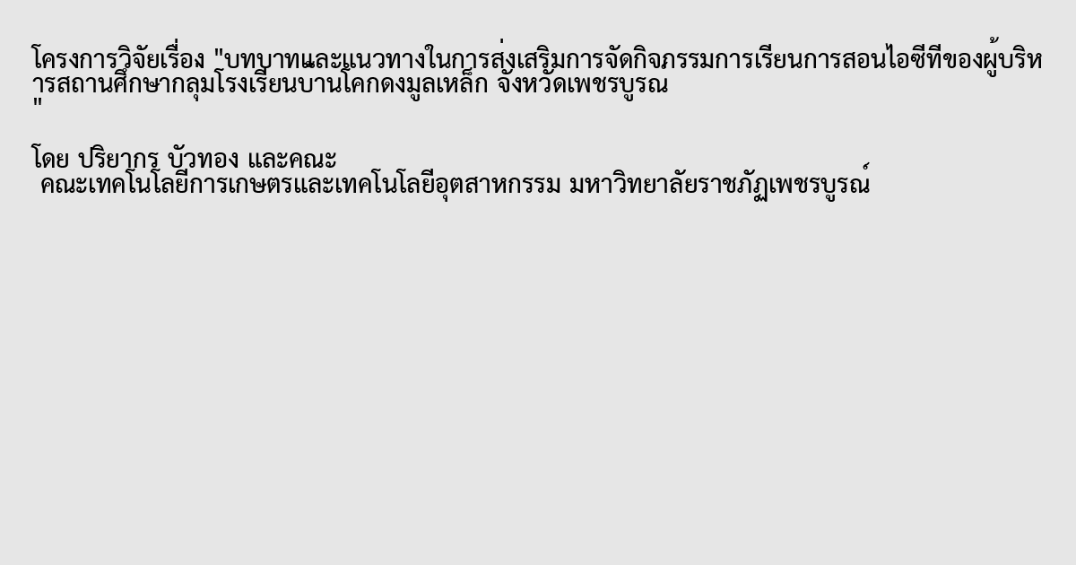 การวิจัยครั้งนี้มีวัตถุประสงค์เพื่อการศึกษาบทบาทของผู้บริหารสถานศึกษาในการส่งเสริมการจัดกิจกรรมการเรียนการสอนไอซีที และการศึกษาแนวทางในการส่งเสริมการจัดกิจกรรมการเรียนการสอนอซีทีชองของกลุ่มโรงเรียนบ้านโคกดงมูลเหล็ก จังหวัดเพชรบูรณ์ โดยมีขอบเขตในการศึกษาบทบาทในการส่งเสริมการจัดกิจกรรมการเรียนการสอนไอซีทีของผู้บริหารสถานศึกษา ของกลุ่มโรงเรียนบ้านโคกดงมูลเหล็ก จังหวัดเพชรบูรณ์ ซึ่งประกอบด้วยบทบาท 4 ด้าน ได้แก่ บทบาทในการสร้างบรรยากาศที่เอื้อต่อการเรียนการสอน บทบาทในการพัฒนาบุคลากร และบทบาทในการประเมินผลกิจกรรมการเรียนการสอน คณะผู้วิจัยได้กำหนดประชากรและทำการสุ่มตัวอย่างแบบเจาะจงประกอบด้วย ผู้บริหารสถานศึกษา ครูผู้สอน และคณะกรรมการสถานศึกษาจำนวน 100 คน ในพื้นที่กลุ่มโรงเรียนบ้านโคกดงมูลเหล็ก จังหวัดเพชรบูรณ์ เครื่องมือที่ใช้ในการเก็บรวบรวมข้อมูลครั้งนี้ เป็นแบบสอบถาม สรุปผลการวิจัยพบว่า ผลการวิเคราะห์ความคิดเห็นของผู้ปฏิบัติงานศึกษา ต่อบทบาทและแนวทางในการส่งเสริมการจัดกิจกรรมการเรียนการสอนไอซีทีของผู้บริหารสถานศึกษา ด้านการสร้างบรรยากาศเอื้อต่อการเรียนการสอน ระดับความคิดเห็นชองผู้ปฏิบัติงานการศึกษาในรายข้อ และภาพรวมอยู่ในระดับมาก (ค่าเฉลี่ย=4.11,ส่วนเบี่ยงเบียนมาตรฐาน=0.07) ด้านการพัฒนาแหล่งเรียนรู้ ระดับความคิดเห็นของผู้ปฏิบัติงานการศึกษา ในรายข้อ และภาพรวมอยู่ในระดับมาก (ค่าเฉลี่ย =4.00,ส่วนเบี่ยงเบียนมาตรฐาน = 0.67) ด้านการพัฒนาบุคลากร ระดับความคิดเห็นของผู้ของปฏิบัติงานการศึกษาในรายข้อ และภาพรวมอยู่ในระดับมาก (ค่าเฉลี่ย =3.88,ส่วนเบี่ยงเบียนมาตรฐาน =0.78) ด้านการนิเทศการจัดการเรียนการสอน ระดับความเห็นของผู้ปฏิบัติงานการศึกษาในรายข้อ และภาพรวมอยู่ในระดับมาก (ค่าเฉลี่ย =3.73,ส่วนเบี่ยงเบียนมาตรฐาน =0.76) ด้านการประเมินผลการจัดกิจกรรมการเรียนการสอน ระดับความคิดเห็นของผู้ปฏิบัติงานการศึกษาในรายข้อ และภาพรวมอยู่ในระดับมาก (ค่าเฉลี่ย =3.83,ส่วนเบี่ยงเบียนมาตรฐาน =0.74)ผลการวิเคราะห์แนวทางในการส่งเสริมการจัดกิจกรรมการเรียนการสอนไอซีทีของผู้บริหารสถานศึกษาพบว่า ด้านการสร้างบรรยากาศเอื้อต่อการเรียนการสอนไอซีที ผู้ปฏิบัติการศึกษาส่วนใหญ่เห็นว่า ผู้บริหารควรส่งเสริมให้ครูอาจารย์พัฒนาสื่อการเรียนการสอนที่เป็นรูปแบบไอซีที ด้านพัฒนาบุคลากร เอื้อต่อการเรียนการสอนไอซีทีผู้ปฏิบัติงานการศึกษาส่วนใหญ่ เห็นว่า ผู้บริหารควรส่งเสริมให้ครูอาจารย์พัฒนาสื่อการเรียนการสอนที่มี