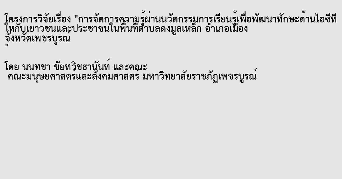 การวิจัยครั้งนี้มีวัตถุประสงค์เพื่อสร้างกระบวนการจัดการความรู้ผ่านนวัตกรรมการเรียนรู้ ด้านไอซีทีให้กับเยาวชนและประชาชนทั่วไป ในพื้นที่ต าบลดงมูลเหล็ก อ าเภอเมือง จังหวัด เพชรบูรณ์ และเพื่อจัดการความรู้จากกระบวนการจัดการความรู้ผ่านนวัตกรรมการเรียนรู้ด้านไอซี ทีพัฒนาเป็นคู่มือแนวทางการจัดการความรู้ชุมชน ซึ่งคณะผู้วิจัยได้ศึกษาการสร้างกระบวนการ เรียนรู้ให้กับเยาวชนและประชาชนทั่วไปได้เกิดทักษะ ความรู้ พื้นฐานเกี่ยวกับคอมพิวเตอร์ และ การประกอบ ต่อวงจรคอมพิวเตอร์ โดยใช้นวัตกรรมการเรียนรู้ด้านคอมพิวเตอร์เป็นแกนกลางใน การจัดการความรู้และเก็บรวบรวม พัฒนาองค์ความรู้จากกระบวนการจัดการความรู้ผ่าน นวัตกรรมการเรียนรู้ให้เป็นคู่มือแนวทางการจัดการความรู้ชุมชน คณะผู้วิจัยได้ก าหนด กลุ่มเป้าหมายในการวิจัย ได้แก่ เยาวชนอายุตั้งแต่ 15 ปี – 25 ปี ทั้งที่อยู่ในระบบการศึกษาและ นอกระบบการศึกษา จ านวน 30 คน และประชาชนทั่วไป จ านวน 30 คน ในพื้นที่ต าบลดงมูลเหล็ก อ าเภอเมือง จังหวัดเพชรบูรณ์ โดย การศึกษาใช้วิธีวิทยาในการศึกษาที่หลากหลาย ได้แก่ วิธีการ สังเกต ( Observation) การสนทนากลุ่ม( Focus Group) การสัมภาษณ์แบบกึ่งโครงสร้าง กระบวนการกลุ่ม การทดสอบก่อนการเรียนรู้ (Pre-Test) การทดลองปฏิบัติ และสรุปบทเรียนหลัง ฝึกปฏิบัติการ(After Action Review) สรุปผลการน าเสนอ ผลการศึกษาแบ่งเป็น 2 ส่วน ได้แก่ 1. การในสู่นอก :องค์ความรู้จากกระบวนการจัดการความรู้อยู่ในตัวคนตามวัตถุประสงค์ในข้อที่หนึ่ง เนื้อหาจะอธิบายรายละเอียดการวิเคราะห์ข้อมูลใน 5 หัวข้อ 1. ความคาดหวังและความรู้ก่อนการ จัดการความรู้ 2. การเรียนรู้ 3. ผลการทบทวนการเรียนรู้ 4. ผลการฝึกทดลองปฏิบัติ 5. ผลการสรุป การเรียนรู้หลังฝึกทดลองปฏิบัติการ( After Action Review) และสรุปวิเคราะห์ในตอนท้าย และ 2. องค์ความรู้ด้านการจัดการความรู้ชุมชนด้านสารสนเทศตามวัตถุประสงค์ในข้อที่สองเพื่อเผยแพร่ ความรู้ให้กับสาธารณะและแวดวงวิชาการต่อไป เป็นการอธิบายวิเคราะห์การกระบวนจัดการ ความรู้ในระดับ การรวบรวมความรู้ที่เป็นความรู้ที่เห็นชัดแจ้ง ( Explicit Knowledge) จากผล การศึกษาในข้อที่หนึ่งที่เป็นความรู้ในระดับ ความรู้ที่อยู่ในตัวคน (Tacit Knowledge) มาจัดเก็บให้ เป็นระบบให้สามารถเข้าถึงและค้นหาได้อย่างสะดวก รวดเร็ว เช่น การจัดท าคู่มือ การจัดการ ความรู้ชุมชน ซึ่งจะได้ขยายรายละเอียดต่อไปข้างหน้า