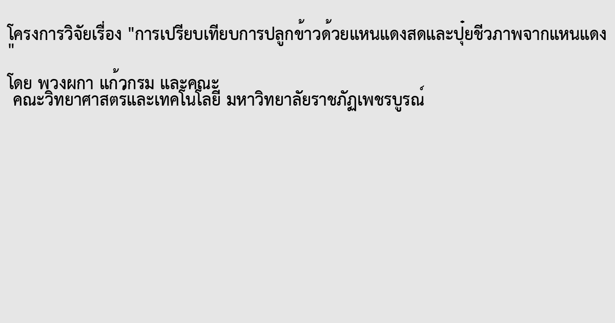 โครงการวิจยัน้ีมีวตัถุประสงค์เพื่อศึกษาการน าเอาแหนแดงแบบสดและปุ๋ ยชีวภาพในรูปแบบ ปุ๋ ยอินทรีย์ชีวภาพจากแหนแดงมาใช้ในการเพิ่มความอุดมสมบูรณ์ของดินและผลผลิตของข้าว การศึกษาในคร้ังน้ีไดท้ า การทดลองในพ้ืนที่ตา บลนาป่าอา เภอเมืองจังหวัดเพชรบูรณ์ โดย ท า การทดลองวัดการเจริญและผลผลิตข้าวในภาคสนามเป็ นเวลา 4 เดือน โดยมีชุดทดลองท้งัหมด3 ชุด ทดลอง คือ ชุดทดลองที่ 1 ใช้ปุ๋ ยเคมี (ชุดควบคุม, T1) ชุดทดลองที่ 2 ใช้ปุ๋ ยเคมีสูตร 16-20-0 และ แหนแดง (T2) และชุดทดลองที่ 3 ใช้แหนแดงและปุ๋ ยอินทรีย์ชีวภาพจากแหนแดง (T3) ผลการศึกษา พบวา่ ชุดทดลอง T1 และ T2 มีค่าความเป็นกรด-ด่างของดินและปริมาณอินทรียว์ ตัถุต่า กวา่ ชุดทดลอง T3 ดงัน้นัการใส่ปุ๋ยเคมีจะส่งผลกระทบต่อค่าความเป็นกรด-ด่างของดินและปริมาณอินทรียว์ ตัถุในดิน ด้านผลผลิตของข้าวในชุดทดลอง T2 และ T3 มีปริมาณผลผลิตของขา้วนอ้ยกวา่ ชุดทดลอง T1แต่เมื่อ ทา การทดสอบดว้ยวธิีการทางสถิติแลว้พบวา่ ปริมาณผลผลิตข้าวไม่มีความแตกต่างกนั จากผลการศึกษา ในคร้ังน้ีสรุปไดว้่าการใช้ปุ๋ยเคมีจะส่งผลกระทบต่อคุณภาพดินในดา้นความเป็นกรด-ด่างและปริมาณ อินทรียวัตถุในดิน ในขณะที่การใช้แหนแดงและปุ๋ ยอินทรีย์ชีวภาพจะสามารถส่งเสริมขา้วมีผลผลิตที่สูง ได้อีกท้งัยงัช่วยสงวนรักษาปริมาณอินทรียวัตถุในดินและรักษาระดับความเป็ นกรด-ด่างของดินให้ คงที่อีกด้วย