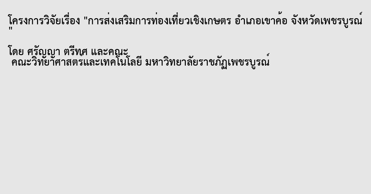 การส่งเสริมการท่องเที่ยวเชิงเกษตร อำเภอเขาค้อ จังหวัดเพชรบูรณ์ มีวัตถุประสงค์เพื่อส่งเสริมการท่องเที่ยวเชิงเกษตร อำเภอเขาค้อ จังหวัดเพชรบูรณ์ และเพื่อประชาสัมพันธ์ด้านการท่องเที่ยวเชิงเกษตร ผลการศึกษาพบว่า ปัจจัยส่งเสริมให้เกิดการท่องเที่ยวเชิงเกษตรขึ้นในอำเภอเขาค้อ คือ การเป็นพื้นที่ที่มีการทำเกษตรกรรม เช่น การเป็นแหล่งเพาะปลูกเสาวรส มะระหวาน กระชายดำ และพืชผักเมืองหนาว รูปแบบกิจกรรมการท่องเที่ยวเชิงเกษตรที่เกิดขึ้นมีทั้งกิจกรรมทางน้ำ กิจกรรมบ้านพักโฮมสเตย์ กิจกรรมด้านการเกษตรและวัฒนธรรม การส่งเสริมการท่องเที่ยวเชิงเกษตรนั้น ต้องดำเนินการทั้งระดับนโยบายและระดับท้องถิ่น โดยเฉพาะองค์กรปกครองส่วนท้องถิ่นและหน่วยงานส่งเสริมด้านการเกษตรและการท่องเที่ยวที่เกี่ยวข้อง ในระดับนโยบาย 1) กิจกรรมท่องเที่ยวเชิงเกษตรโดยชุมชน มีความเกี่ยวข้องกับการใช้ทรัพยากรเกษตรที่เป็นศักยภาพเชิงพื้นที่โดยเฉพาะสภาพแวดล้อมทางทรัพยากรธรรมชาติและการเกษตร ซึ่งเป็นทรัพยากรท่องเที่ยวเชิงเกษตรที่สำคัญ เพื่อตอบสนองความต้องการของนักท่องเที่ยวด้านการพักผ่อน ดังนั้นในระดับนโยบายควรกำหนดให้พื้นที่ต่าง ๆ ที่มีศักยภาพดังกล่าวเป็นพื้นที่ที่มีความเหมาะสมจะพัฒนาเป็นแหล่งท่องเที่ยวเชิงเกษตร โดยสนับสนุนงบประมาณให้แก่องค์กรปกครองส่วนท้องถิ่นและองค์กรเอกชนในพื้นที่ดังกล่าวที่มีแผนงานโครงการด้านการพัฒนาการท่องเที่ยวเชิงเกษตร 2) รณรงค์กิจกรรมท่องเที่ยวเชิงเกษตร ประเภทการมีส่วนร่วมในกิจกรรมการเกษตร การเรียนรู้ประเพณีวัฒนธรรมชนบท และการสัมผัสธรรมชาติการเกษตรของชุมชนให้มากขึ้น เพื่อให้ชุมชนต่าง ๆ ที่มีศักยภาพดังกล่าวเกิดการตื่นตัวในการรวมกลุ่มและพัฒนาชุมชนให้เป็นแหล่งท่องเที่ยวเชิงเกษตร สนับสนุนให้หน่วยงานที่เกี่ยวข้องมีโครงการศึกษาดูงานด้านการพัฒนาชุมชนโดยเฉพาะกิจกรรมเกษตรทางเลือกประเภทต่าง ๆ เพื่อกระตุ้นให้ชุมชนมีทักษะด้านการบริหารจัดการ การต้อนรับผู้มาเยือนและมีการพัฒนากิจกรรมอื่น ๆ เพื่อเป็นแหล่งท่องเที่ยว ในระดับท้องถิ่น ส่วนในระดับท้องถิ่น 1) สร้างกิจกรรมการท่องเที่ยวเชิงเกษตรให้ความหลากหลาย ครอบคลุมกิจกรรมนันทนาการต่าง ๆ เช่น การเดินป่า หรือกิจกรรมสัมผัสธรรมชาติในลักษณะอื่น ๆ ซึ่งเป็นที่ชื่นชอบของนักท่องเที่ยวเชิงเกษตรหรือเชิงนิเวศ 2) ส่งเสริมให้เกษตรกรนำทรัพยากรเกษตรที่มีอยู่แล้วแต่มิได้ใช้เพื่อการเกษตรมาพัฒนาให้เป็นกิจกรรมการท่องเที่ยว เช่น ที่พักในฟาร์มแ