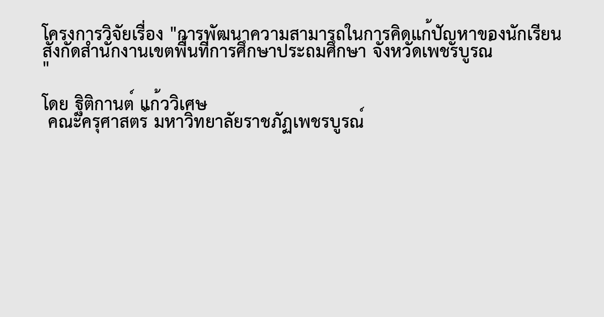 งานวิจัยนี้มีวัตถุประสงค์ 2 ประการ ได้แก่ 1 ) พัฒนาความสามารถในการคิดแก้ปัญหาของนักเรียน สังกัดสำนักงานเขตพื้นที่การศึกษาประถมศึกษา จังหวัดเพชรบูรณ์ และ 2 ) เพื่อประเมินผลการพัฒนาความสามารถในการคิดแก้ปัญหาของนักเรียน สังกัดสำนักงานเขตพื้นที่การศึกษาประถมศึกษา จังหวัดเพชรบูรณ์ วิธีการดำเนินการวิจัยแบ่งออกเป็น 2 ระยะ ได้แก่ ระยะที่ 1 พัฒนากระบวนการพัฒนาความสามารถในการคิดแก้ปัญหาของนักเรียน และระยะที่ 2 การประเมินกระบวนการพัฒนา กลุ่มตัวอย่างที่ใช้ในการศึกษาครั้งนี้ ได้แก่ โรงเรียนขนาดใหญ่ ขนาดกลาง ขนาดเล็ก จำนวน 3 โรงเรียน นักเรียน 60 คน ผู้วิจัยคัดเลือกสถานศึกษาโดยเจาะจง (Purposive Sampling) ดำเนินการวิเคราะห์ข้อมูลด้วยวิธีการทางสถิติ โดยใช้คอมพิวเตอร์โปรแกรมสำเร็จรูป ได้แก่ 1 ) วิเคราะห์การดำเนินงานตามกระบวนการพัฒนา โดยหาค่าเฉลี่ย ( x̄ ) และค่าเบี่ยงเบนมาตรฐาน (S.D.) ทั้งภาพรวม รายด้านและรายข้อ 2 ) วิเคราะห์ความพึงพอใจต่อกระบวนการพัฒนาโดยหาค่าเฉลี่ย ( x̄ ) และค่าเบี่ยงเบนมาตรฐาน (S.D.) ทั้งภาพรวม รายด้านและรายข้อ และ 3 ) เปรียบเทียบความผลการทดลอง ก่อน-หลัง ใช้กระบวนการพัฒนา โดยการทดสอบค่าที (t-test)