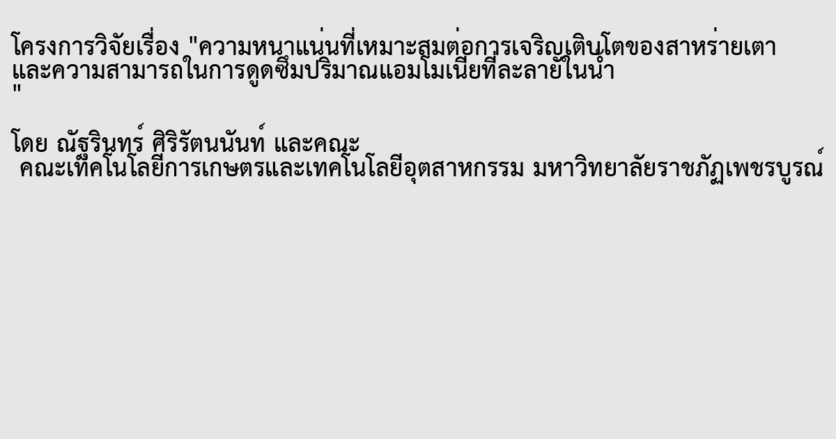 การศึกษาความหนาแน่นที่เหมาะสมต่อการเจริญเติบโตของสาหร่ายเตาและความสามารถ ในการดูดซึมปริมาณแอมโมเนียที่ละลายในน้า วางแผนการทดลองแบบสุ่มตลอด Completely randomized design (CRD) ประกอบด้วย5 ชุดการทดลอง ชุดการทดลองละ 3 ซ้า โดยเล้ียงสาหร่าย เตาที่ระดบัความหนาแน่น 0 (ชุดควบคุม) 1 3 5 และ 7 กรัม/ลิตร ท าการทดลองเป็ นระยะเวลา 3 สัปดาห์ และศึกษาความสามารถในการดูดซึมปริมาณแอมโมเนียที่ละลายในน้า ของสาหร่ายเตาที่ เล้ียงในระดบัความหนาแน่นที่เหมาะสมต่อการเจริญเติบโต โดยท าการทดลองเป็ นระยะเวลา 3 วัน ผลการศึกษาพบวา่ สาหร่ายเตาในทุกชุดการทดลองมีน้า หนกั ที่เพิ่มข้ึน และอตัราการเจริญเติบโต สูงสุดในสัปดาห์ที่ 1 หลงัจากน้นัค่อยๆลดลงในสัปดาห์ที่2 และ 3 ตามลา ดบั น้า หนกัที่เพิ่มข้ึน และ อตัราการเจริญเติบโตของสาหร่ายเตาจะลดลงเมื่อเล้ียงในระดับความหนาแน่นที่เพิ่มข้ึน โดย สาหร่ายเตาที่เล้ียงในระดับความหนาแน่น 1กรัม/ลิตร มีน้ าหนักที่เพิ่มข้ึน และอัตราการเจริญ เติบโตสูงกวา่ ชุดควบคุม และชุดการทดลองอื่นๆ เมื่อสิ้นสุดการทดลองสาหร่ายเตาที่เล้ียงในระดบั ความหนาแน่น 1กรัม/ลิตร มีน้า หนกั ที่เพิ่มข้ึนเฉลี่ย และอัตราการเจริญเติบโตเฉลี่ยสูงกวา่ ชุดการ ทดลองอื่นๆ มีค่าเท่ากบั 1.41±3.62กรัม และ 0.46±0.38 กรัม/วัน ตามล าดับ ซึ่ งมีความแตกต่าง อย่างมีนยัส าคญั ทางสถิติ(p<0.05) เมื่อเปรียบเทียบกบั ชุดการทดลองที่เล้ียงสาหร่ายเตาในระดับ ความหนาแน่น 5 และ 7 กรัม/ลิตร แต่ไม่แตกต่างอย่างมีนัยส าคัญทางสถิติ(p>0.05) เมื่อ ( ข) เปรียบเทียบกับชุดการทดลองที่เล้ียงสาหร่ายเตาในระดับความหนาแน่น 3 กรัม/ลิตร ดังน้ัน การเล้ียงสาหร่ายเตาที่ระดบัความหนาแน่น 1 กรัม/ลิตร ส่งผลให้สาหร่ายเตามีน้า หนกั ที่เพิ่มข้ึน และอตัราการเจริญเติบโตที่ดีที่สุดและการเล้ียงใชร้ะยะเวลา 1 สัปดาห์จะท าให้ได้ผลผลิตสูงกว่า การเล้ียงใช้ระยะเวลา 2 หรือ 3 สัปดาห์นอกจากน้นัการเล้ียงสาหร่ายเตาที่ระดบัความหนาแน่น 1 กรัม/ลิตร สามารถช่วยดูดซบั ประมาณแอมโมเนียที่ละลายในน้า ไดเ้ท่ากบั 0.034±0.009 มิลลิกรัม/ ลิตร/วัน/สาหร่าย 1 กรัม
