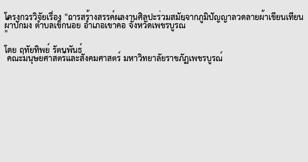 การสร้างสรรค์ผลงานศิลปะร่วมสมัยจากภูมิปัญญาลวดลายผ้าเขียนเทียน ผ้าปักม้ง ตำบลเข็กน้อย อำเภอเขาค้อ จังหวัดเพชรบูรณ์