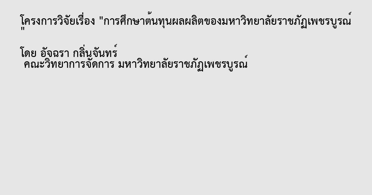 การศึกษาเรื่องการวิเคราะห์ต้นทุนต่อหน่อยผลิตของมหาวิทยาลัยราชภัฏเพชรบูรณ์ประจำปีงบประมาณ2550 ครั้งนี้มีวัตถุประสงค์เพื่อ 1) การวิเคราะห์ต้นทุนจำแนกตามศูนย์ต้นทุน (Cost Center) 2) วิเคราะห์ต้นทุนจำแนกตามกิจกรรมหลัก และ 3) วิเคราะห์ต้นทุนจำแนกตามผลผลิต วิธีการศึกษาจากเอกสาร (Documentary Study) โดยเก็บข้อมูลทุติยภูมิจาก ระเบียบปฏิบัติวาน เอกสารต่างๆ ที่เกี่ยวข้อง