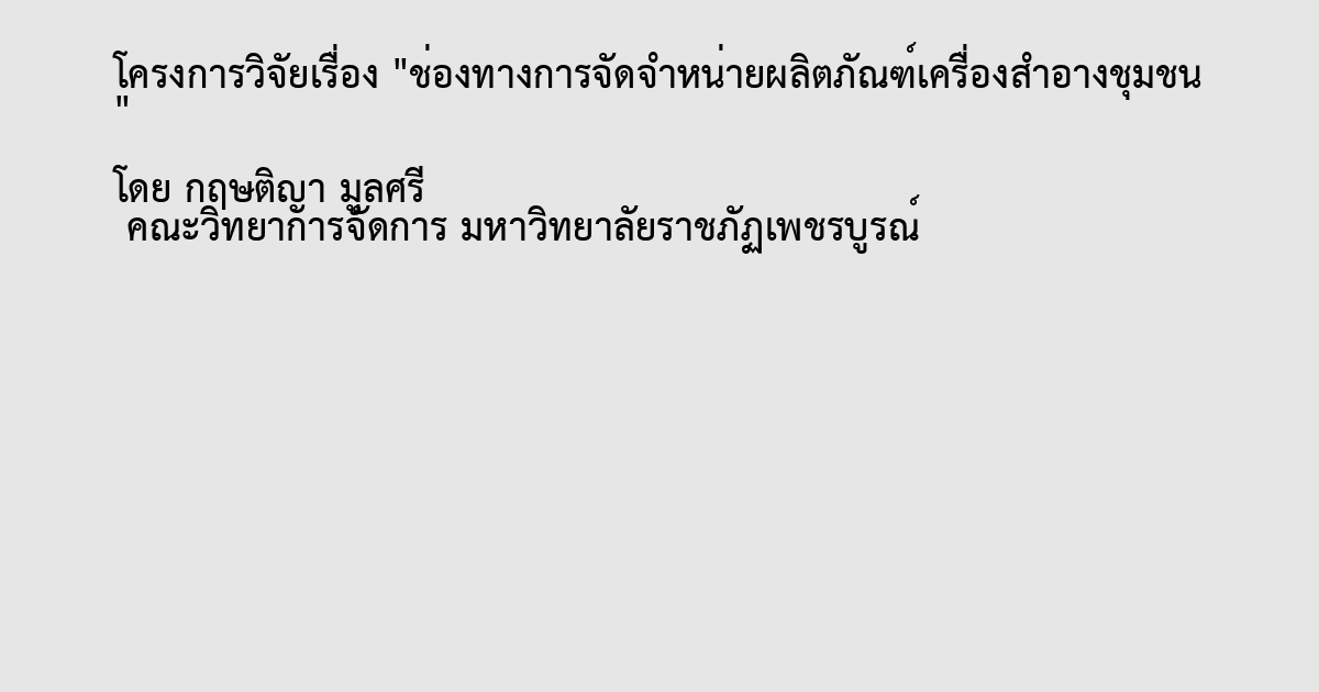 การวิจัยนี้มีวัตถุประสงค์สองประการคือ (1) เพื่อศึกษาพฤติกรรมการซื้อผลิตภัณฑ์เครื่องสำอางชุมชนของผู้บริโภคด้านสถานที่ (2)เพื่อให้ได้รูปแบบช่องทางการจักจำหน่ายผลิตภัณฑ์เครื่องสำอางชุมชนในเชิงพาณิชย์